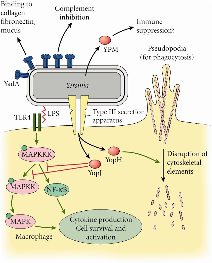 Y. enterocolitica es una bacteria pequeña de forma redonda y Gram-negativa, la cual es aislada frecuentemente de los especímenes clínicos tales como las heridas, las heces fecales, el esputo o las glándulas linfáticas mesentéricas. Sin embargo, no forma parte normal de la flora humana. Por otro lado, Y. pseudotuberculosis ha sido aislada del apéndice infectado en los humanos.