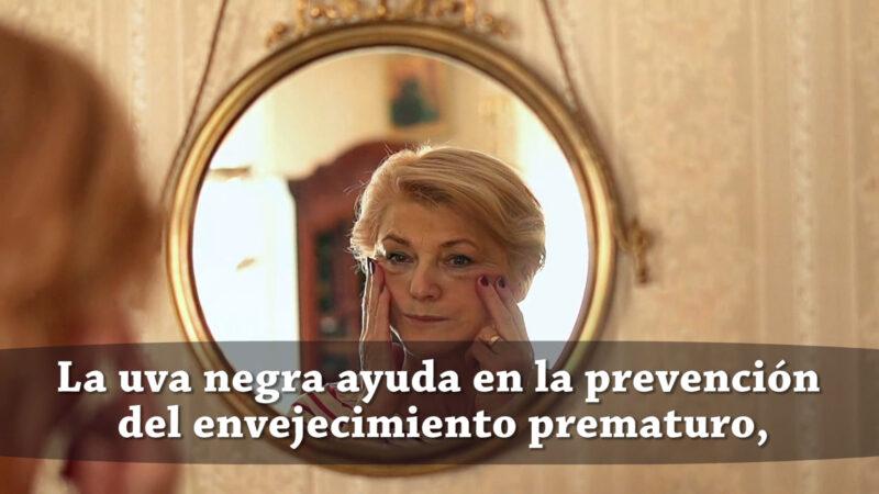 La uva negra ayuda en la prevención del envejecimiento prematuro, por su alta concentración de antioxidantes. Tomar zumo de uva negra incluyendo la piel, la pulpa y las semillas, alimenta y favorece el sistema circulatorio, optimizando la salud cardiovascular, el sistema inmune y especialmente indicado en estados anémicos.