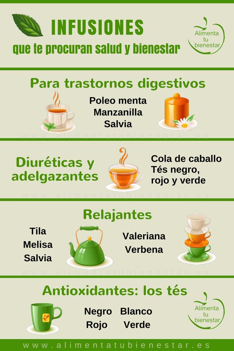 Es importante saber distinguir bien una infusión de una tisana. Así por ejemplo una infusión se prepara hirviendo primero el agua y luego se introduce la planta medicinal para que se disuelva y ejerza sus efectos beneficiosos terapéuticos y la tisana se consigue hirviendo la planta medicinal en agua. El café, el té, la manzanilla, el poleo-menta, la tila, la cola de caballo, la valeriana, la melisa, la salvia, la infusión de jengibre y de cúrcuma y otras son infusiones que aportan numerosos beneficios a nuestra salud y están englobadas en el grupo de bebidas saludables. Se pueden consumir varias veces al día aunque se aconseja no abusar de ellas.