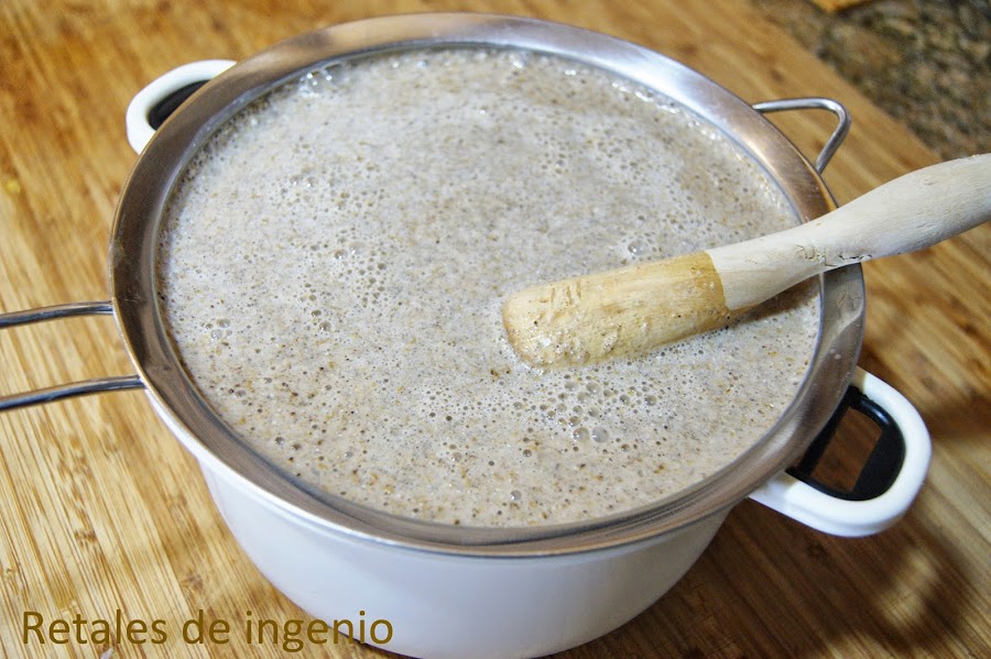 Se trituran junto con la canela con muy poca agua para que las agarre mejor las cuchillas. Han de triturarse mucho para que suelten toda la parte interna del grano y después se le añade mas agua y se vuelve a triturar. Hasta completar el litro. Yo hago el doble para tener para varios días.