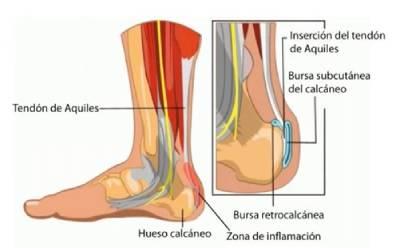 El tendón de Aquiles tiene dos bolsas; una interna retrocalcánea y otra externa o subcutánea. Por su situación, es la bursa externa la que más se irrita o inflama debido al roce del contrafuerte de nuestro calzado.Esta patología muchas veces se vincula a la Aquileitis y las causas principales de su aparición son: