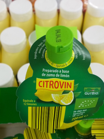 Ella me comentó que le daba un poco de pereza ponerse cada mañana a exprimir medio limón y si lo podía substituir por el zumo de limón que ya vendían hecho. No el típico zumo de limón, si no ese que se vende en un bote de plástico con forma de limón. Me apuntó: es bio!!!