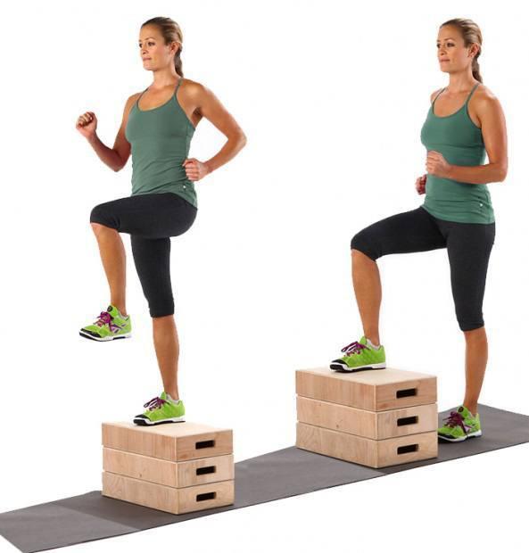 Toma un pequeño banco, escalón o silla que tengas en casa en el cual puedas sostener tu cuerpo.Párate frente a ella y apoya una de tus piernas sobre la silla, ahora usando la fuerza de tus piernas y glúteos súbete a ella, y la pierna que queda en el suelo, la subes hasta la altura de tu pecho.