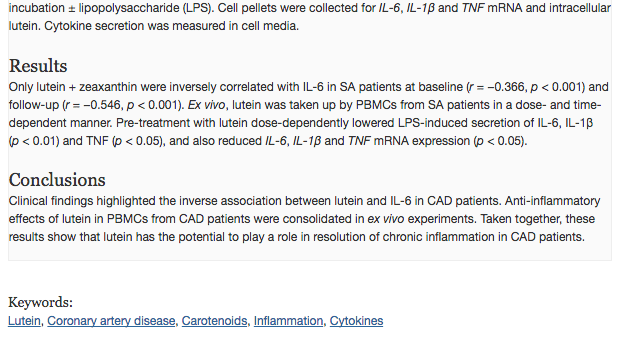 La luteína, un carotenoide que se encuentran de forma natural en la caléndula y vegetales de hoja oscura (espinacas, canónigos, rúcula, etc) puede suprimir la inflamación en personas con enfermedad de las arterias coronarias, según este estudio:
