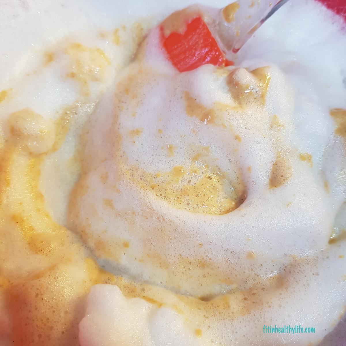 Mezclamos el queso batido con edulcorante y colorante verde.