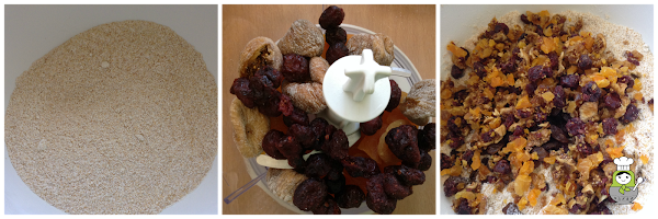 En el vaso de la picadora ponemos las frutas secas (pasas, higos, arándanos y orejones) y los picamos en trozos pequeños. Los añadimos a la mezcla de la harina y el azúcar.