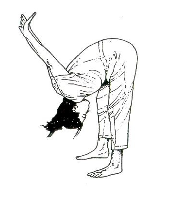 Párate con las piernas rectas y las rodillas sueltas (sin bloquearlas), separando los pies al ancho de caderas. Entrelaza los pulgares de las manos por detrás de la espalda. Mientras inspiras profundamente, estira los brazos por detrás de la espalda y comienca a bajar el torso hacia adelante a la vez que exhalas todo el aire. Mantén esa posición a la vez que respiras en el Hara (abdomen inferior, tres dedos por debajo del ombligo) y siente el estiramiento en brazos y piernas. Realica tres respiraciones completas en esta posición, procurando bajar más el torso y elevar más los brazos por encima de tu cabeza a medida que exhalas. Luego desarma la postura lentamente y repite la operatoria pero cruzando los dedos pulgares en el otro sentido.