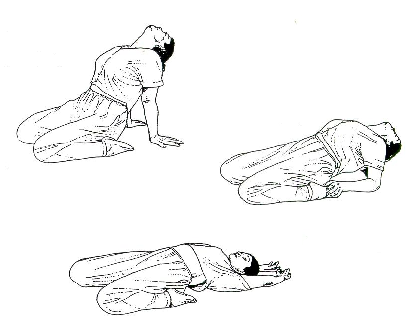 Arrodíllate sobre una superficie acolchada (puede ser un mat de goma eva o una colchoneta) y siéntate entre tus talones o sobre ellos si no puedes hacerlo como indica la figura. Respira profundamente en el Hara y, al exhalar, apoya las manos detrás de tu espalda, echando la cabeza ligeramente hacia atrás junto con el torso. Relaja el cuello y eleva el mentón lo más que puedas, siempre sintiendo comodidad durante el estiramiento. Repite tres respiraciones completas en esta posición. Si te sientes demasiado cómodo, puedes pasar a la siguiente postura apoyando los antebrazos en el suelo (o colchoneta) a medida que exhalas e inhalas suavemente. Repite otras tres respiraciones completas.