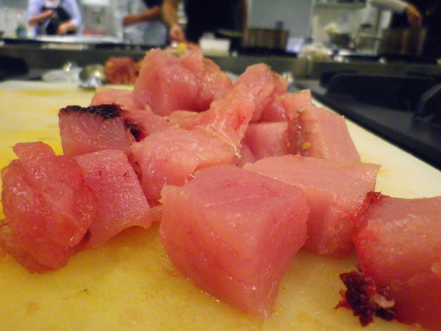 -Después, añadimos el bonito limpio y cortado en tacos.