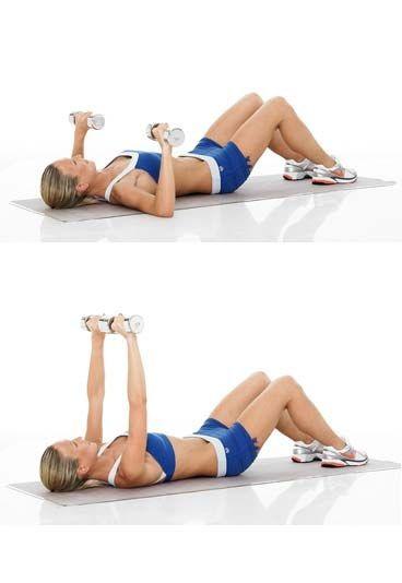 Puedes optar por comprar unas ligas o unas mancuernas y realizar press de pecho.Si escoges las mancuernas, te recomiendo acostarte sobre la colchoneta y realizar dicho movimiento para trabajar el pecho, recuerda que debes apretar el pecho sin chocar las mancuernas y siempre con los brazos estirados.