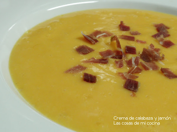 Esta rica crema, tan nutritiva como sencilla es obra de Patricia de Las cosas de mi cocina, que la acompaña de unas lascas de jamón. Un plato así entra muy bien en estos días de frío.