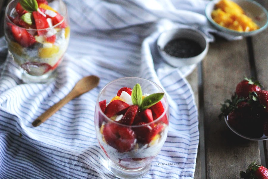 Coloca una capa de fresas , cubre con el pudin de chía y cúrcuma, una capa de mango, otra de pudin, fresas, mango y las hojitas de menta.