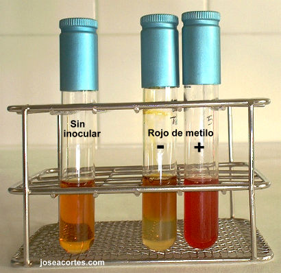 Se funda en la capacidad que poseen algunos microorganismos de actuar sobre la glucosa, y a través del ácido pirúvico producir una fermentación ácido mixta, capaz de bajar el pH a una cifra igual o inferior a 4,4. Se utiliza el medio de Clark-Lubs descrito en la prueba de Voges-Proskauer, y como reactivo la Solución de rojo de metilo al 0,5 por 100 en alcohol de 60º. Inocular una colonia, con ansa de platino, en el caldo e incubar un mínimo de 48 horas a 37º C. Determinados microorganismos necesitan una incubación más prolongada. Después de la incubación, añadir cinco gotas del reactivo al caldo de cultivo. Se considera la prueba como positiva si aparece una coloración roja. Una coloración amarilla la califica como negativa, y una coloración anaranjada indica que la prueba es dudosa y que se deberá repetir.