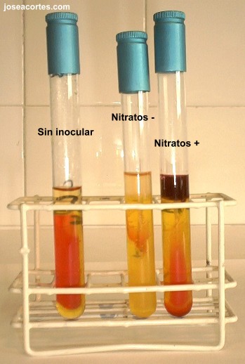 Acido acético 5N al 30 por 100: csp 1.000 mlMantener los reactivos A y B en frasco oscuro y en la heladera sin congelar. Sembrar por picadura e incubar a 37° C durante 24 – 48 horas. Añadir 0,5 ml. de reactivo A y a continuación 0,5 ml. del reactivo B. La aparición de un color rojo después de treinta segundos indica la presencia de nitritos en el medio. La reducción de los nitratos puede dar otros productos más reducidos como amoniaco, nitrógeno molecular, óxido nítrico, óxido nitroso o hidroxilamina, dependiendo de la especie bacteriana, en tal caso, después de la adición del reactivo, no se aprecia cambio de color en el medio. Para confirmar que el proceso es negativo es necesario añadir una pequeña cantidad de polvo de zinc, el cual, en caso de que existan nitratos, los reducirá a nitritos, volviendo el medio de color rojo, e indicando consecuentemente que antes no se había producido la reacción. Si después de la adición del polvo de zinc el color no vira a rojo, indica que ha habido reducción y que el producto obtenido no ha sido el nitrito.