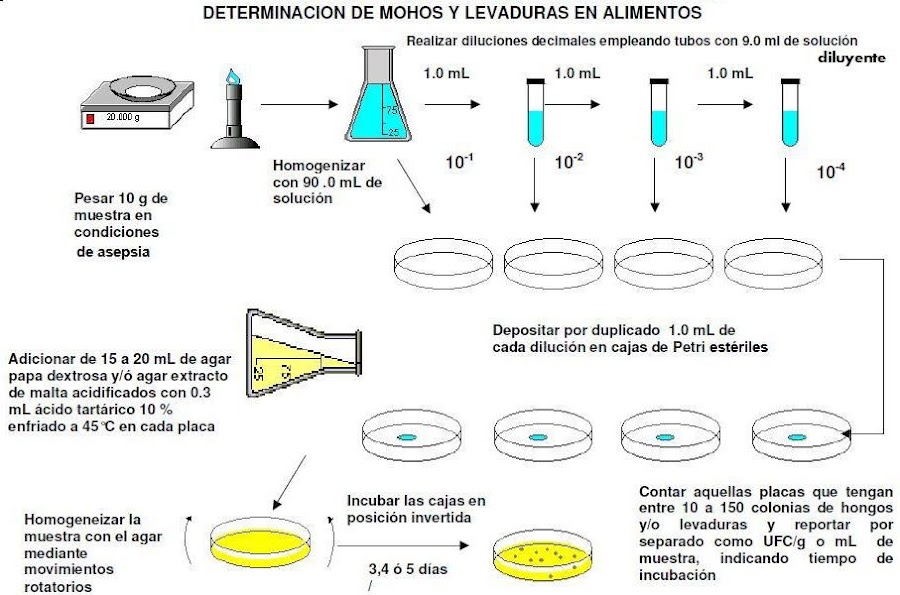 Las levaduras y los mohos, constituyentes de la flora micótica total a investigar, generalmente se han cultivado en medios de pH bajo (3,5 - 5,5) y a temperaturas de 20° - 30º C si bien muchas bacterias crecen en estas condiciones. Para inhibir las bacterias se utilizan antibióticos de amplio espectro que incorporados a los medios de cultivo inhiben el crecimiento de aquéllas. Un medio típico es el agar oxitetraciclina-glucosa-extracto de levadura, que lleva como agente selectivo oxitetraciclina y entre otros nutrientes glucosa y que se ajusta a un pH relativamente alto, aproximadamente 6,5. Los métodos de ensayo de las aflatoxinas difieren algo, dependiendo del alimento. Generalmente el alimento se pica suficientemente y a continuación se extrae con un solvente adecuado, como el cloroformo. Se purifica el extracto y la fase siguiente de detección implica algún tipo de cromatografía, generalmente en capa fina. Con el empleo de solventes que separan netamente las toxinas, se pueden comparar cualquier tipo de manchas que den fluorescencia bajo la luz UV con los correspondientes estándares. El significado de la contaminación fúngica de los alimentos, especialmente por mohos, viene no sólo del potencial de los mohos para deteriorar los alimentos, sino también del potencial de muchos de ellos para producir una gran variedad de micotoxinas a las que el hombre es sensible, así como su capacidad para provocar infecciones e incluso, reacciones alérgicas a personas hipersensibles a los antígenos fúngicos. En cuanto al significado para la salud del consumidor, la acción de las levaduras es meramente infectiva.