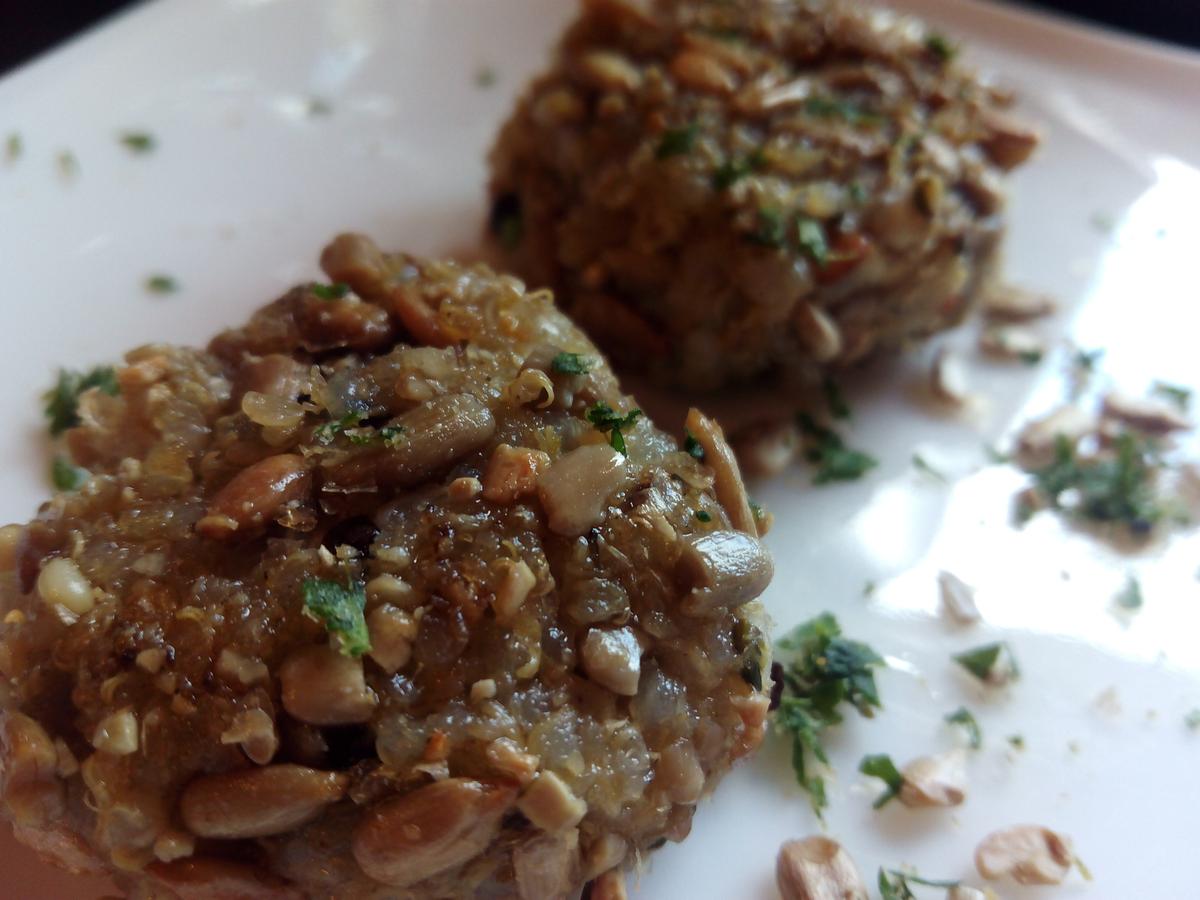 Tostar un puñado de pipas de girasol, las trituramos y rebozamos con ellas las mini hamburguesas.