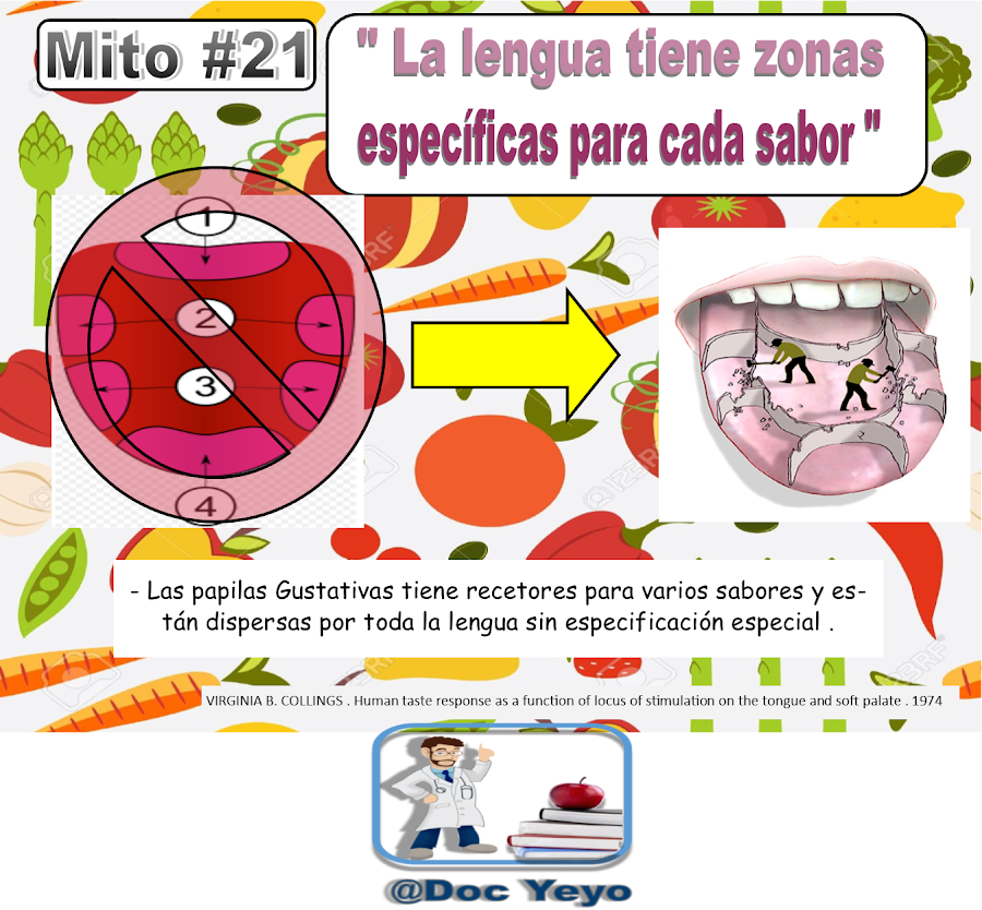 - Todo provino de una mala traducción de los trabajos de David P. Hänig, quien mencionaba algo similar pero de forma insignificante y los siguientes interpretaciones lo dieron por un hecho: la lengua tiene un mapa de sabores. Fue hasta 1974 que Virginia B. Collings revisó minuciosamente y reinició el debate, mostrando que la diferencia es mínima y que incluso cada papila gustativa podría percibir otros sabores. Así fuimos avanzando hasta descubrir que existen receptores para diferentes sabores en cada papila y que están repartidas desde la punta de lengua hasta la epiglotis.
