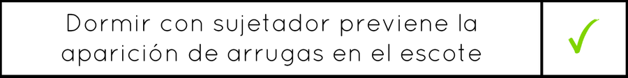 ¿Dormir con sujetador previene la aparición de arrugas en el escote? Correcto, ahora bien, no siempre ni con todos los modelos. Lo ideal es que optemos por alternativas específicamente diseñadas para el descanso nocturno. Es decir, que dejen libre el pecho, y que se adhieran a la zona del escote evitando la formación de pliegues. La presión mantenida durante 8 horas en la zona del escote produce arrugas y, al no existir intervención quirúrgica efectiva para erradicar este problema estético, debemos recurrir a prendas de este tipo.