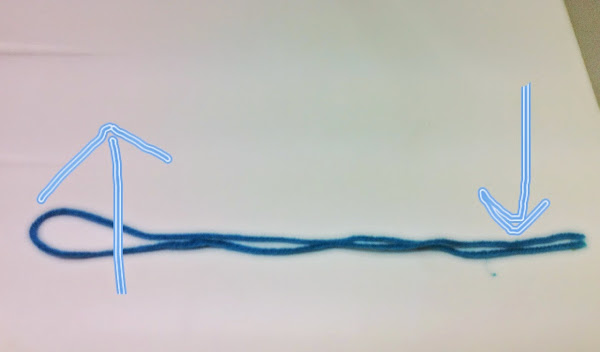 Segundo paso: (aquí es donde necesitamos ayuda). Pedimos a alguien que coja de un extremo de las hebras, mientras que nosotros cogemos el otro y nos colocamos cada uno en una punta, sin llegar a tensar el hilo (porque se nos escapará seguro y vuelta a empezar). Entonces, comenzamos a retorcer el hilo, en direcciones opuestas, cada uno hacia un lado, de forma que quede así: