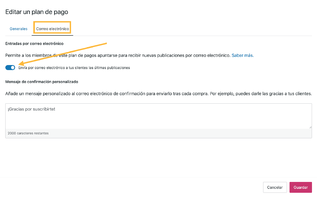 Si quieres que tus seguidores puedan escoger suscribirse a tu nuevo contenido Premium por correo activa la opción de “Entradas por correo” en las configuraciones de tu plan de membresía.