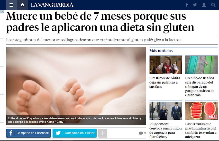 Ahora vendrán los que se lo creen, y nos contarán que comer sin gluten es malo, y entonces me verán como una pobre enferma paranoica. Y cuando me inviten a comer a su casa, ellos se pondrán doble ración de gluten en su plato, para no ser como yo... que pobrecilla de mí, soy celíaca y en cualquier momento me puedo morir como el bebé del titular ese.