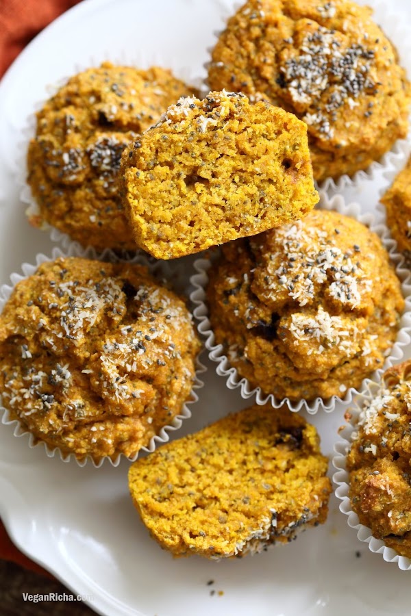 - Mezcle el húmedo y seco hasta que casi combinado. Si es demasiado líquido, agregue unas pocas cucharadas más de harina. Poner en una lancha para muffins . Adorne con semillas de chia y coco.