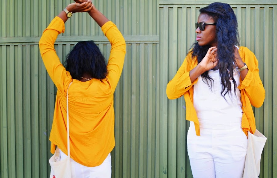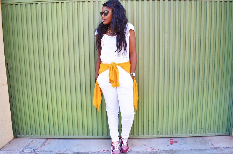 Esta me parece super graciosa, y además con un diseño única... Que mona tan molona eh? :D Para completar el outfit total white y camisa mostaza para el fresquito.