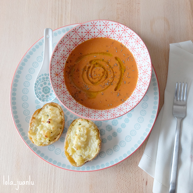 Sopa de tomate y tomillo asado con Patatas rellenas de queso de cabra y cebollino