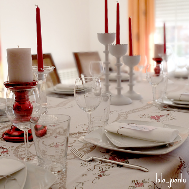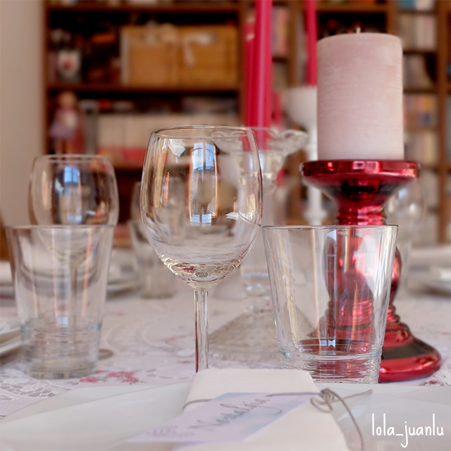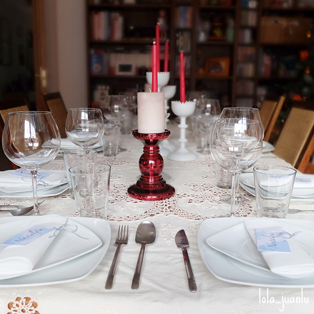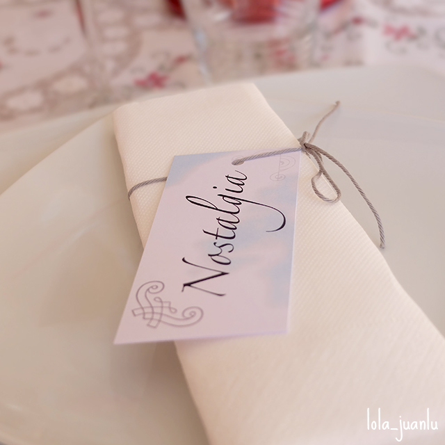 Y luego, la decoración de la mesa, claro está, acorde con el menú. Colocando unas etiquetas que hice para cada comensal. ¿Qué os parecen?