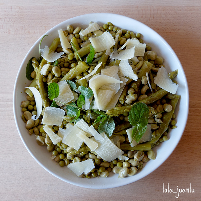 Ensalada verde de espárragos, guisantes, habitas baby y menta con queso parmesano