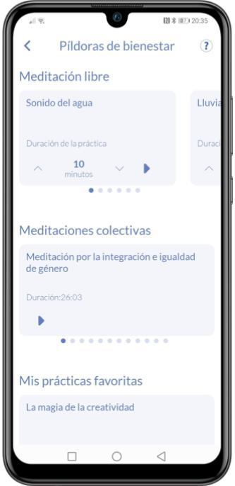 Al entrar en tu app verás de manera muy sencilla la sesión que vas a realizar, y ya no hace falta descargar y luego pulsar el play. Directamente, al pulsar en Meditar comenzará la descarga y en pocos segundos se iniciará el audio incluso aunque no haya acabado de descargarse aún..PÍLDORAS DE BIENESTAR