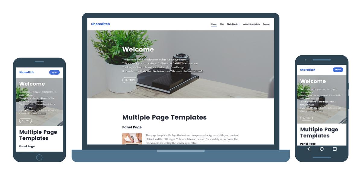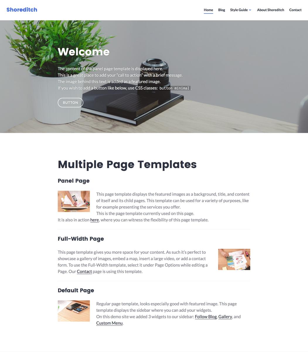 Shoreditch, diseñado y desarrollado por Thomas Guillot, es un tema adaptable y multifunción. Shoreditch, que se suministra con un plantilla de página de panel y una plantilla de página de anchura completa, es una solución perfecta para la presencia en línea de una empresa. Aunque está diseñado principalmente para empresas, Shoreditch también funciona muy bien como tema de un blog personal gracias a su flexibilidad y diseño claro.