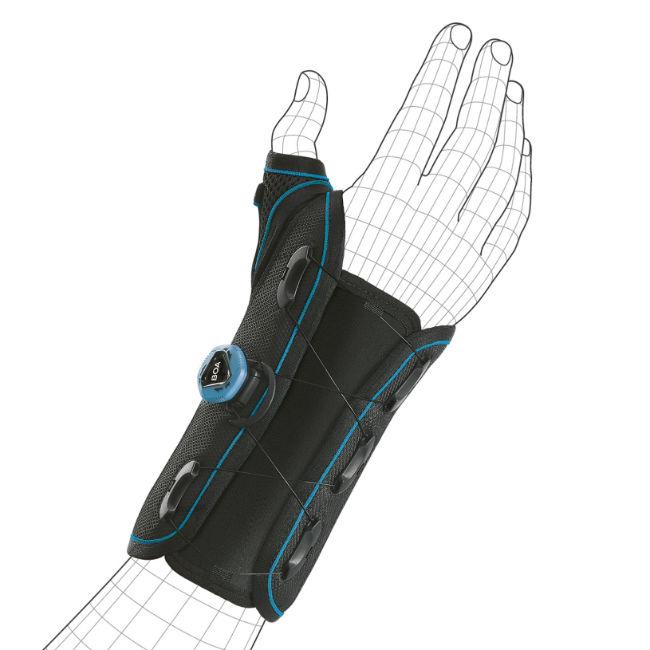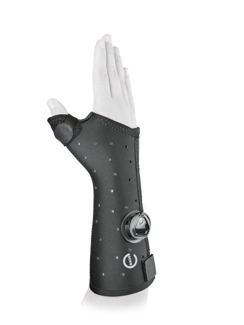 Ambas férulas llevan inmovilizadores tanto de muñeca como de pulgar, pero además empiezan a dejar libre la primera falange del dedo pulgar que hasta ahora teníamos también limitada en movimiento, y se terminan de ajustar o bien con velcros o con el mismo sistema BOA de la férula Exos.