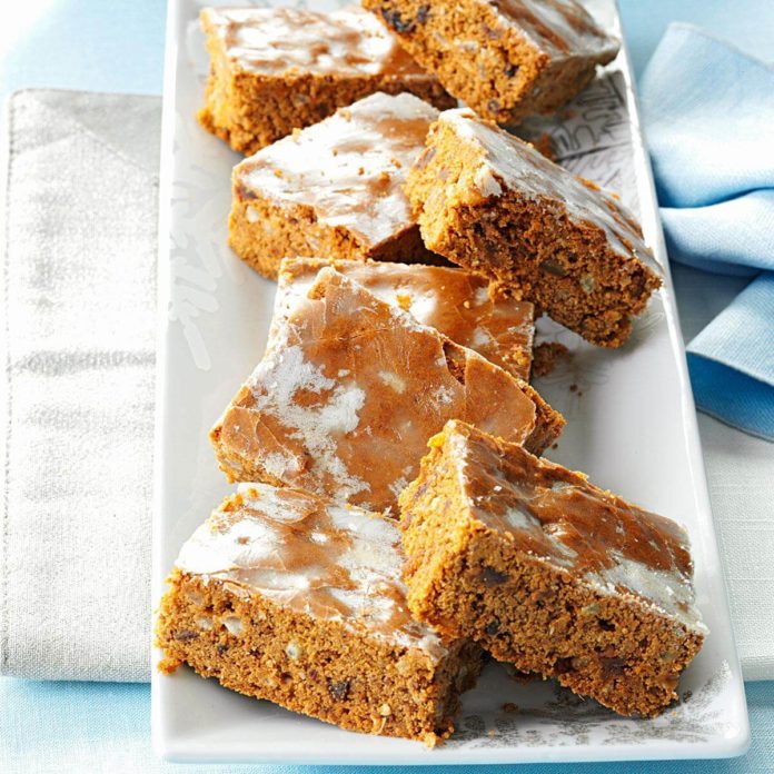 Para el glaseado, en una cacerola pequeña, hierva el azúcar y el agua; hervir 1 minuto. Retírelo del calor; Batir en azúcar de repostería. Extender sobre las barras calientes. Enfriar completamente en el molde sobre una rejilla de alambre.