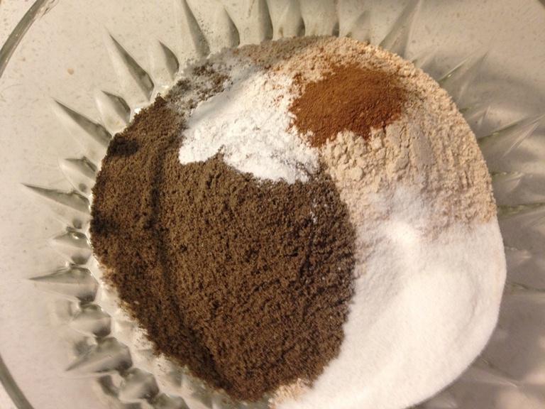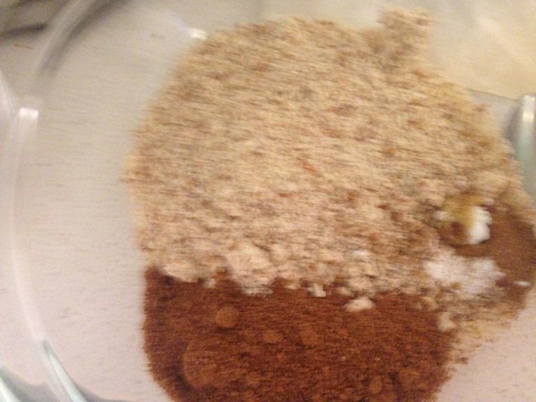 Mezclar todos los ingredientes secos, harina integral, avena, harina chia, tagatosa, polvos de hornear y especies. Mezclar bien.