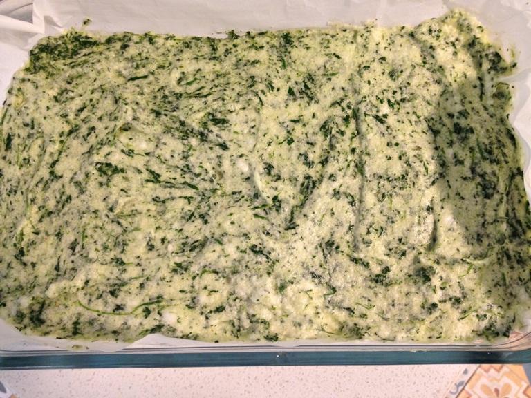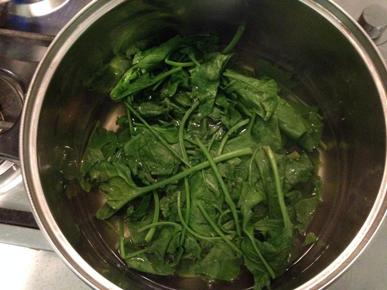 Lavar la espinaca y ponerla a cocer en agua hirviendo durante 5 minutos (Con poca agua). Precalentar el horno.
