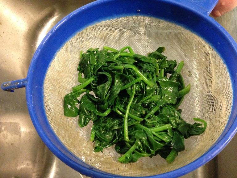 Una vez cocida la espinaca, colar y botar todo el agua. Apretar bien con las manos para que quede bien seca.
