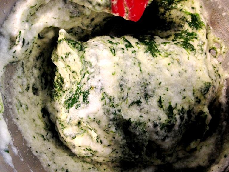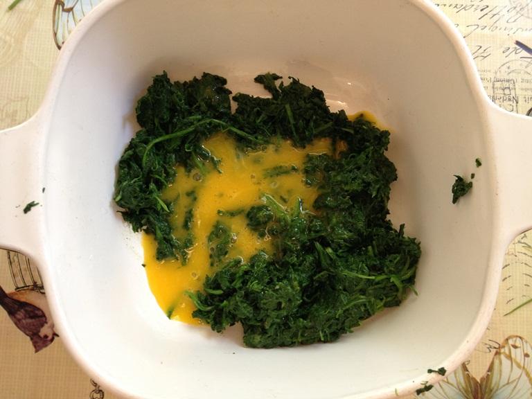 Agregar yemas a la pasta de espinaca. Agregar la sal, aliño y ajo. Revolver hasta mezclar todo bien.