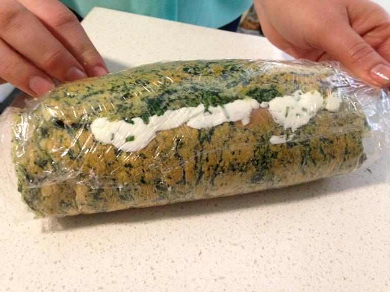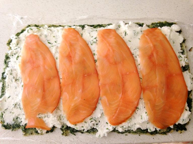 Agregar el Salmón sobre la pasta de yogurt. Luego de esto con mucho cuidado comenzar a enrollar, apretando bien con el papel plastico para que quede firme.