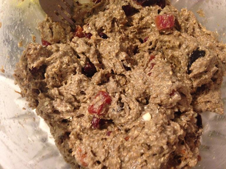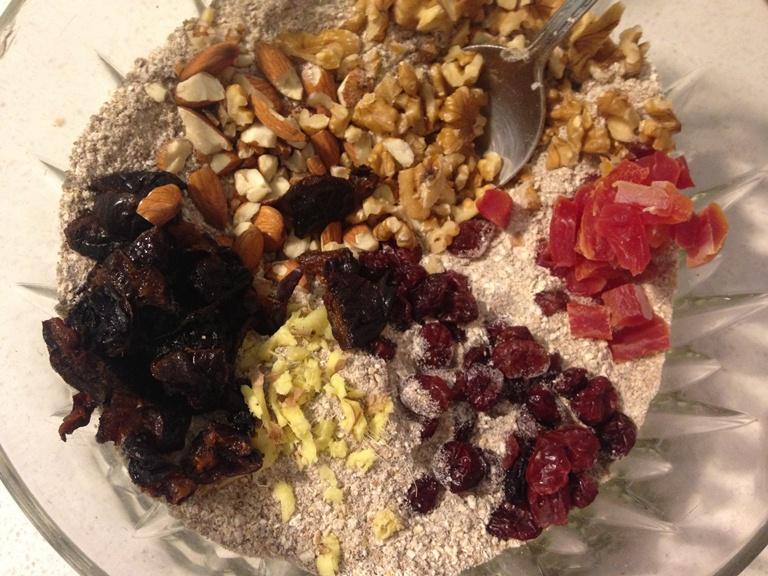 Mezclar los frutos con las harinas. Guarda un poco para decorar al final.