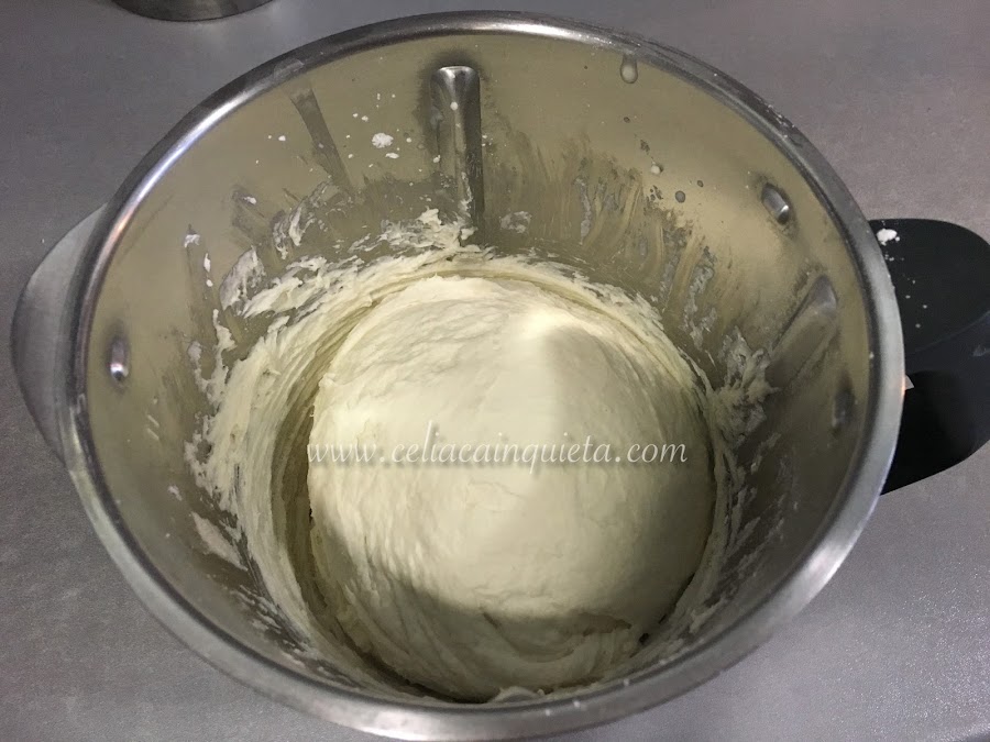 Meter todos los ingredientes, incluyendo la levadura deshecha, en la Thermomix a velocidad espiga hasta conseguir una masa homogénea (creo recordar que no tarda ni un minuto).
