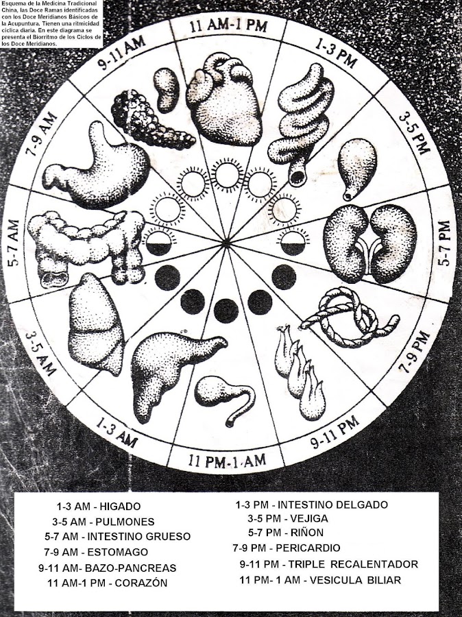 Cada órgano y víscera tiene un lapso de 2 horas de máxima plenitud energética a lo largo de las 24 hs del día, en las que realizan actividades propias de su función. A saber: