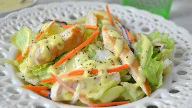 Ensalada de pollo, miel y mostaza