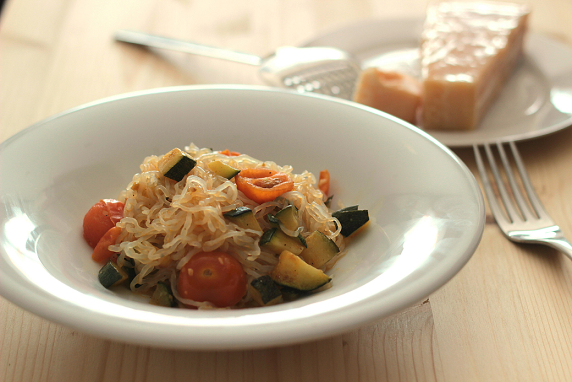 Esta pasta es muy saludable y saciante, ya que al hacerla con la pasta de Konjac es un alimento que se hincha en el estómago por los líquidos que consumimos, además es muy baja en carbohidratos. EL único aporte de hidratos es por parte del tomate y es muy bajo, sin sal ya que el parmesano le aporta ese puntito, pero tu puedes rectificarlo.