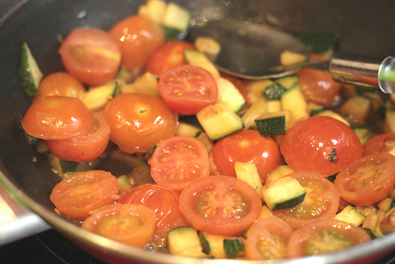 Sofreímos en aceite caliente el calabacín hasta que esté al dente, añadimos el tomate y cocinamos a fuego bajo,