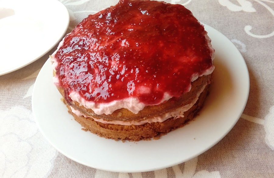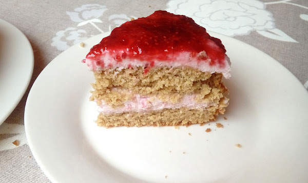 Me encantan las tartas con nata y fruta e hice pastel de bizcocho de avena con nata y frambuesas.