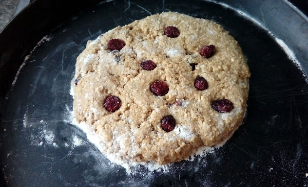 Un puñado de arándanos secos en agua caliente, para que se hidraten.Es muy fácil de hacer, se juntan todos los ingredientes, apartamos unos cuantos arándanos para poner encima, amasamos y tenemos una masa un poco pegajosa, la ponemos en una bandeja de horno y la aplastamos y la adornamos con los arándanos.