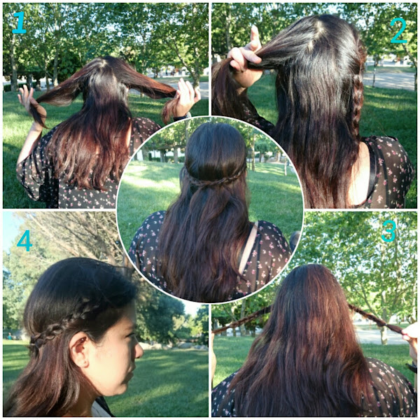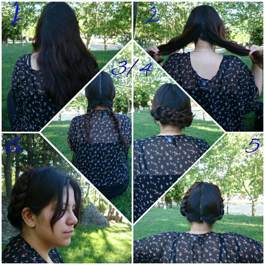 3. Una vez hecho esto vamos a llevar nuestras trenzas hacia atrás y las vamos cruzar escondiendo de esta formas las puntas. Las aseguraremos con orquillas (Bobby pins) hasta que queden sujetas y ¡listo!