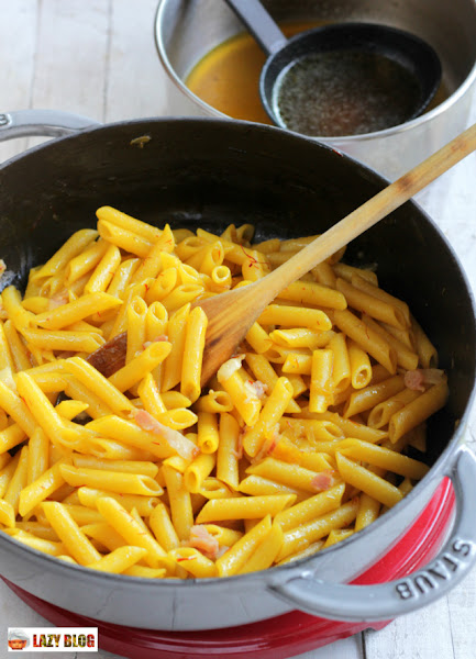 Estoy muy contento con esta receta de penne al azafrán, una receta de pasta italiana que he cocinado con la técnica del risotto y el resultado es una auténtica delicia, ya que la pasta queda al dente y aunque está suelta como se ve en la foto, sí tiene un cierto toque de mantecado, aunque no le he añadido queso para disfrutar más de los aromas originales de la preciada especia.