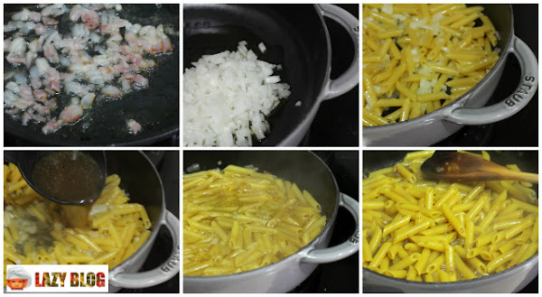 Comenzamos poniendo la cacerola al fuego y en ella damos una vuelta al bacon para que suelte su grasa y se tueste un poco. En la misma grasa, ponemos la cebolla bien picada y removemos hasta que se transparente. Añadimos entonces los macarrones y removemos dejando que se impregnen de los ingredientes, hasta tomar un color brillante.